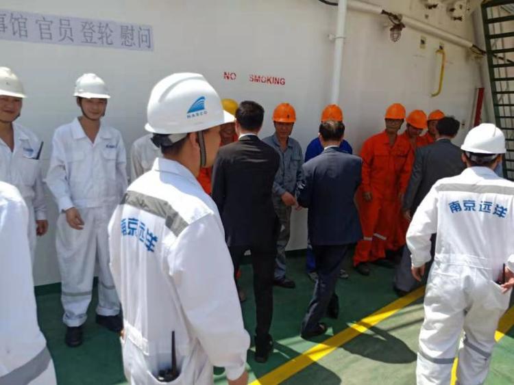 2019年6月25日是第九个“世界海员日”。昨天,中国驻沙特大使馆在达曼港对集团南京远洋“中华门”轮全体中国船员进行慰问,陈伟庆大使及赵参赞等一行7人,于当地时间13点08分登轮,全体船员在何船长带领下在甲板列队迎接大使一行并由衷表示感谢。